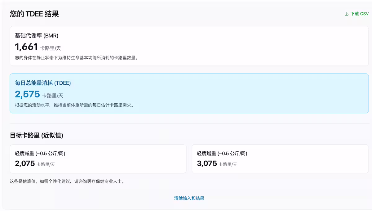 减脂的话,基于TDEE制造热量缺口是最有效的方法。每天500-750卡的缺口,每周能减1-2磅,这既安全又可持续。计算器会自动算出这些数值,帮你设定现实目标。
